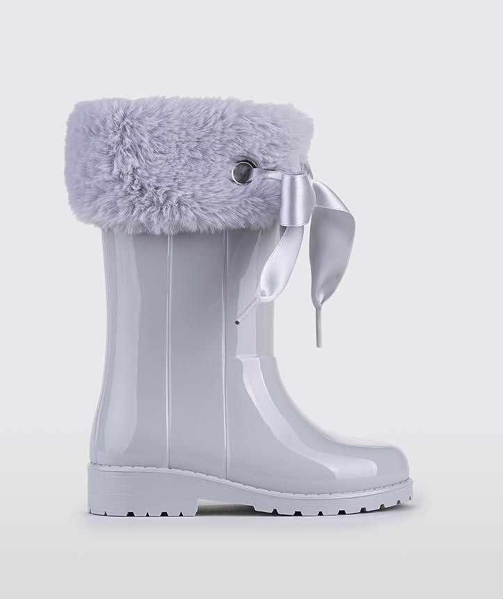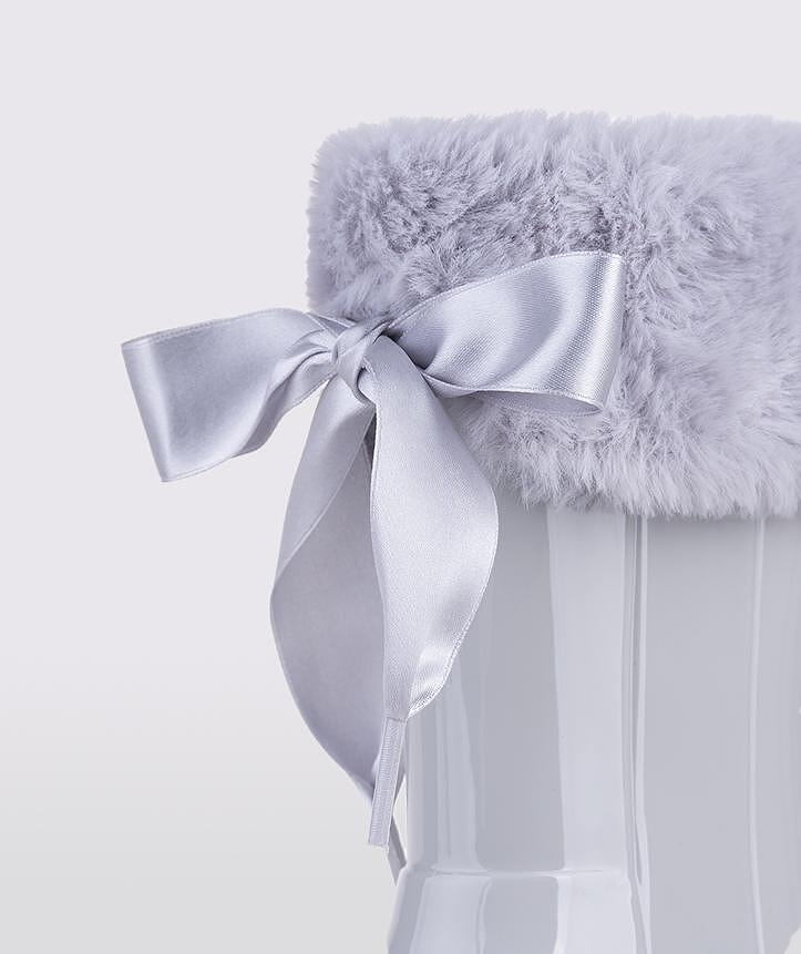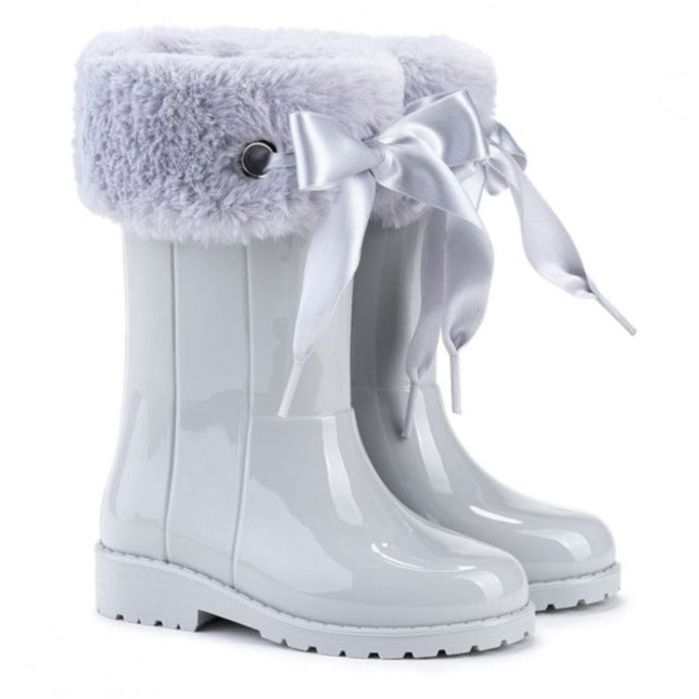 Made of PVC and waterproof, these boots are great for all seasons . Faux fur with a bow. These boots are not lined with fur.