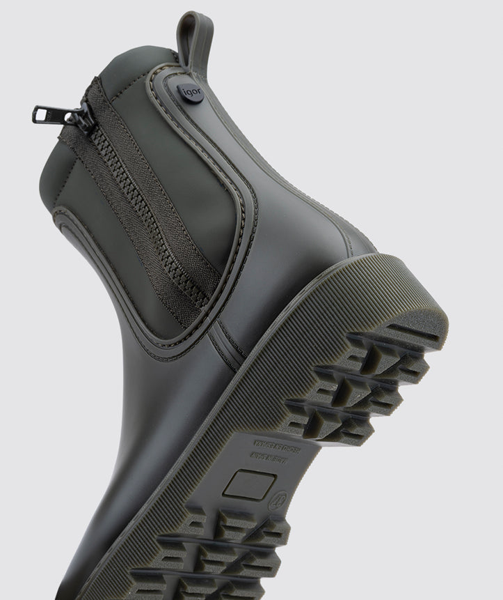 The Igor Women's Chloe Engomado Boots in Kaki are stylish and functional. These zip up boots are perfect for rainy days, keeping your feet dry while adding a touch of style to any outfit. Stay chic and dry with these unique boots.